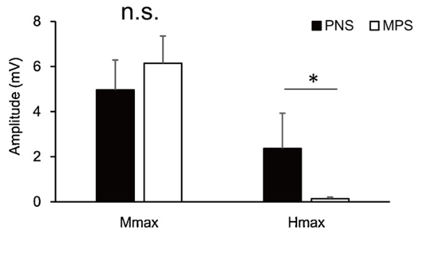 1. ヒラメ筋へのMPSではH反射が誘発されなかったが、PNSでは明確なH反射が観察された