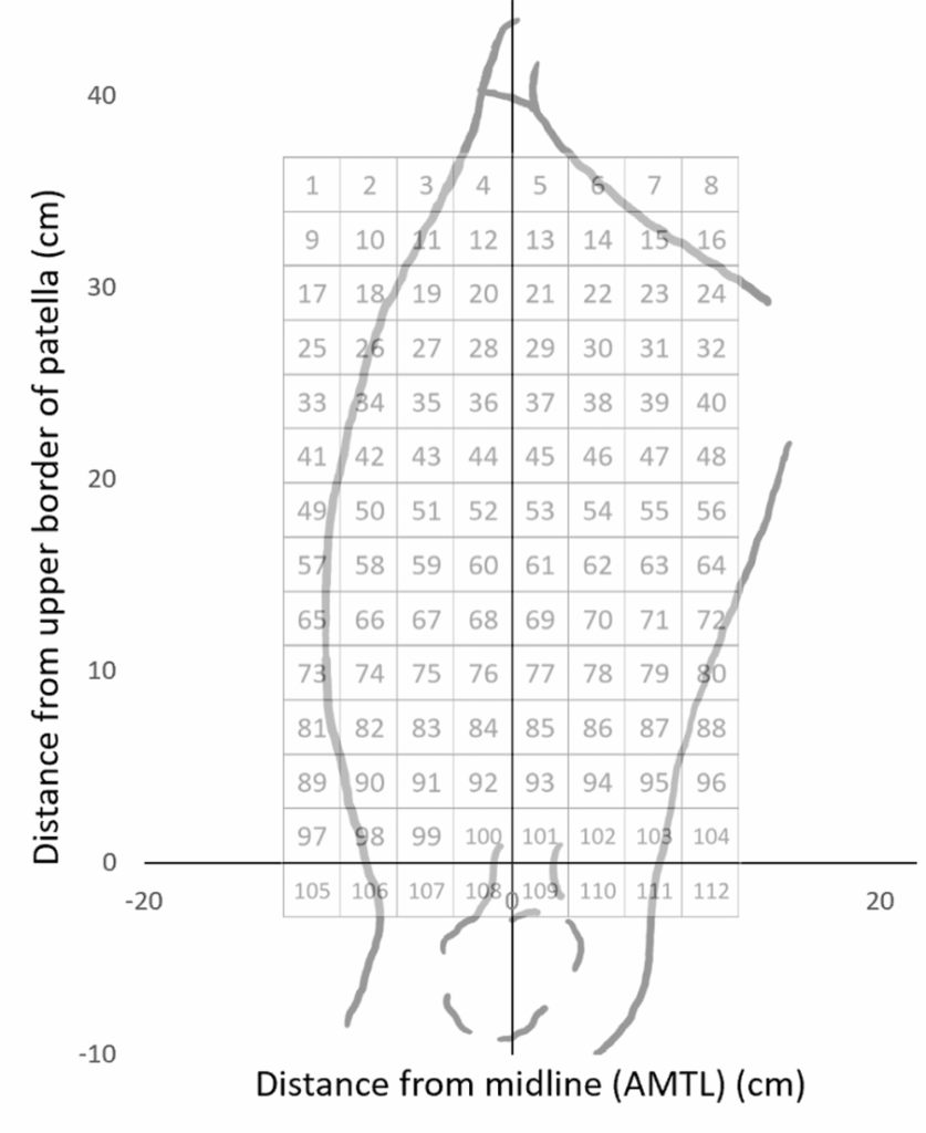 大腿解剖を標準化し、112個(8×14)の3×3cm区画に分け、各区画でのMP発見確率を計算してヒートマップを作成