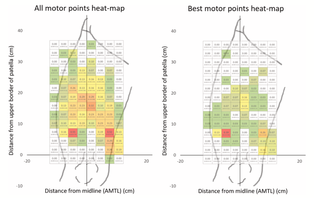 (All motor points heat-map: すべてのモーターポイントの分布、 Best motor points heat-map: 最も効率的な刺激が得られるモーターポイント)