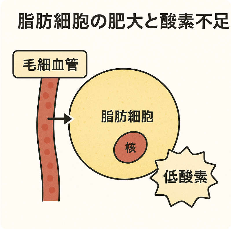 脂肪細胞が肥大化すると、周囲の毛細血管では酸素供給が追いつかず「低酸素状態」に、これが細胞ストレスとなり、炎症反応が始まる