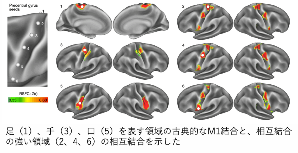 SCANは運動皮質上に、効果器領域(手、足、顔)と交互に現れるパターンで配置されており、それぞれ明確に異なる神経的ネットワークを形成しています