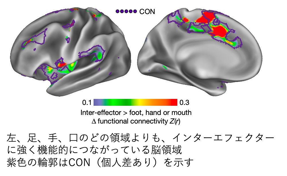 運動皮質には、従来の身体部位ごとの効果器領域に加えて、目標志向的な行動制御に関わる認知的ネットワーク(SCAN)が交互に配置されていることが明らかになりました