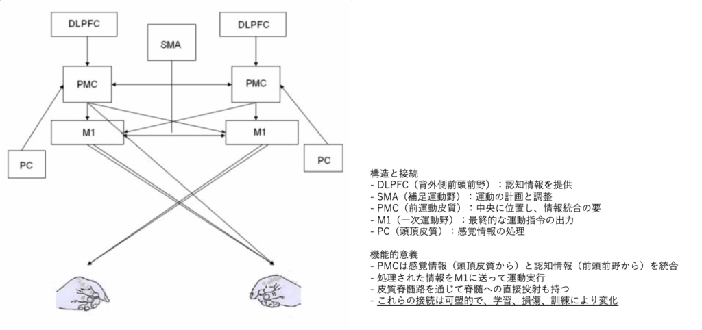 一次運動野(M1)の前方に位置し、運動階層において重要な役割を果たす