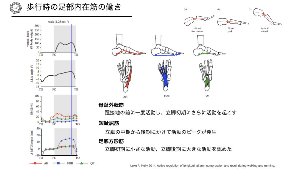 Lukeらは歩行時に重要な足部内在筋の活動を計測し、どのタイミングで活動を起こしているかを計測しています
