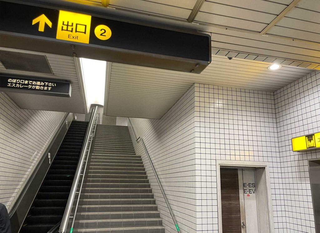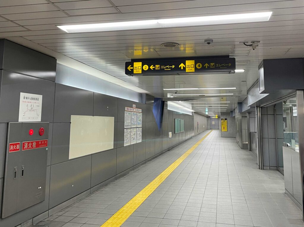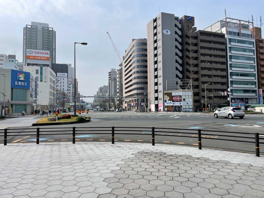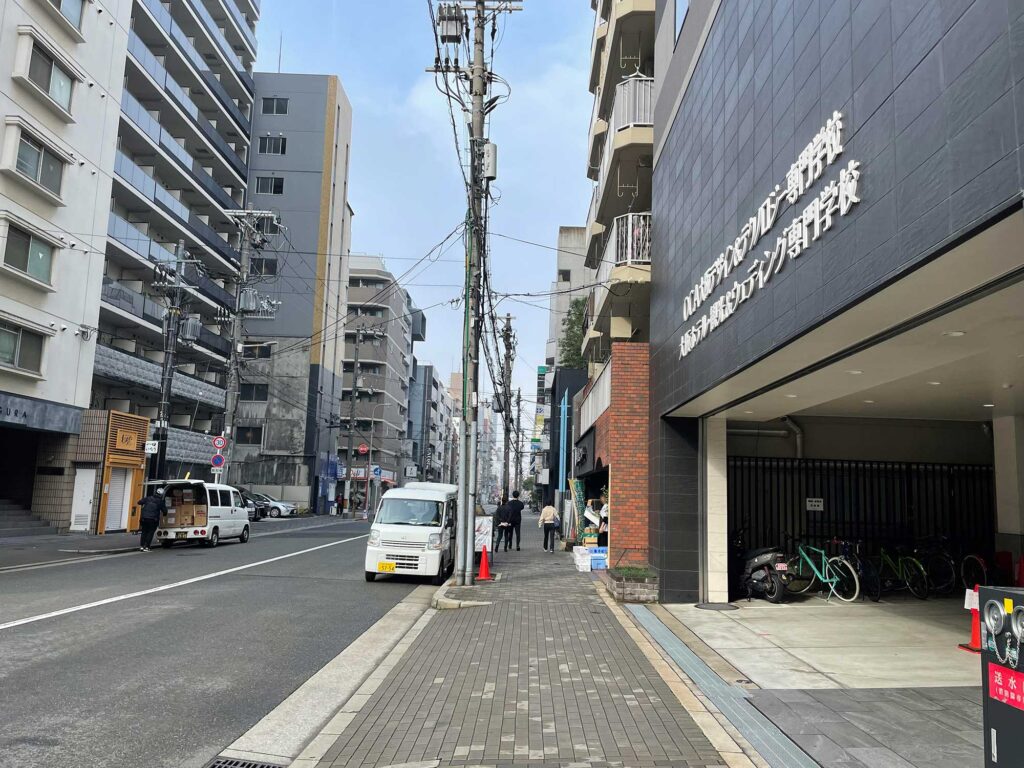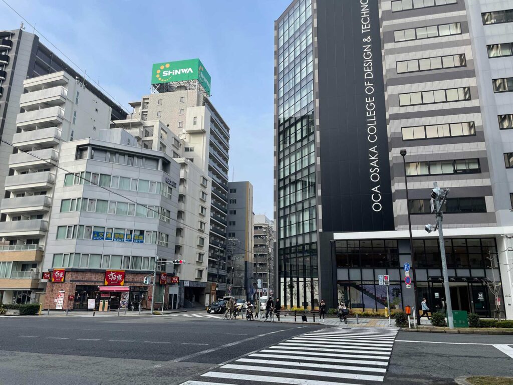 交差点を渡ってから2つ目の信号で、右手のOCA大阪デザイン&テクノロジー専門学校の方へ渡ります。