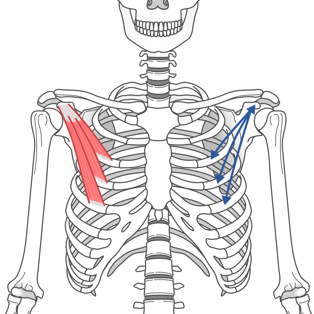 第2肋骨下部束の線維は肋骨付着部に対してほぼ水平に走行し、最も薄い筋束でありながら最大の生理学的断面積を有します。これは肩鎖関節での肩甲骨外旋(および内旋制御)、続いて胸鎖関節での鎖骨前方突出の役割を支持します。