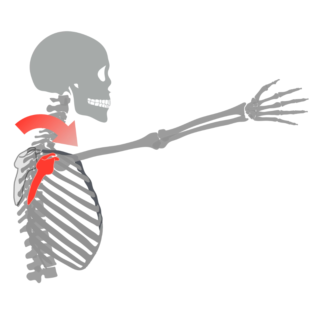 前鋸筋の機能不全に起因する肩甲骨の前傾アライメントが慢性化すると、二次的な軟部組織の問題、すなわち適応性短縮が引き起こされます。その代表格が、肩甲骨の烏口突起から第3〜5肋骨に付着する小胸筋です。