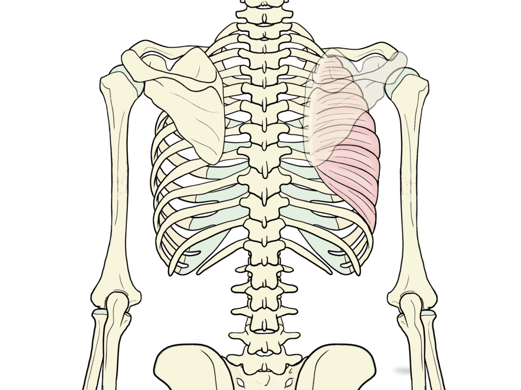 走行:肋骨から始まり、肩甲骨の裏側(胸郭との間)を通り、肩甲骨の内側縁に付着します。