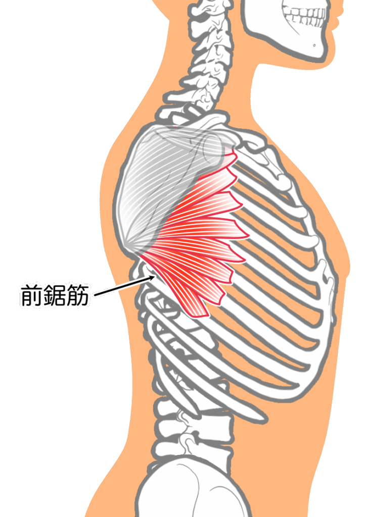 前鋸筋は、その名の通り鋸(のこぎり)の歯のようにギザギザとした形状を持つ、胸郭側壁を覆う幅広い筋です。