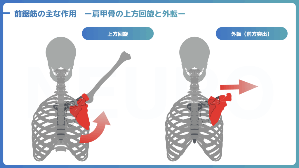 肩甲骨では下角に集中して付着し、前方下方に向かって第8/9-4肋骨に28°から78°の角度で付着します。これらの線維は下角を胸壁に沿って外側方向(正中線から離れる方向)に引っ張り、ベクトル的には肩甲骨の上方回旋が主な役割となります。