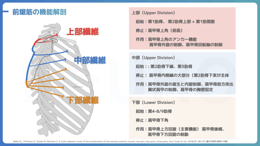Webbの解剖学的研究では、前鋸筋を3つのパートに分類しており、それぞれの繊維の作用について詳細に示しています。