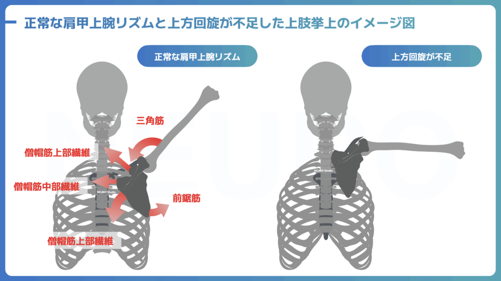 この不均衡な活動は、肩甲骨の純粋な上方回旋ではなく、過度な「挙上(elevation)」、つまり肩をすくめるような代償運動を引き起こします。この代償運動は、インピンジメントを助長するだけでなく、頚肩腕部の過剰な筋緊張や痛みの原因ともなり得ます。
