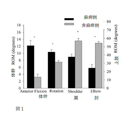 ・麻痺側では非麻痺側と比較して、体幹の動きが増加し方の屈曲と肘の伸展が減少した(図1より)
