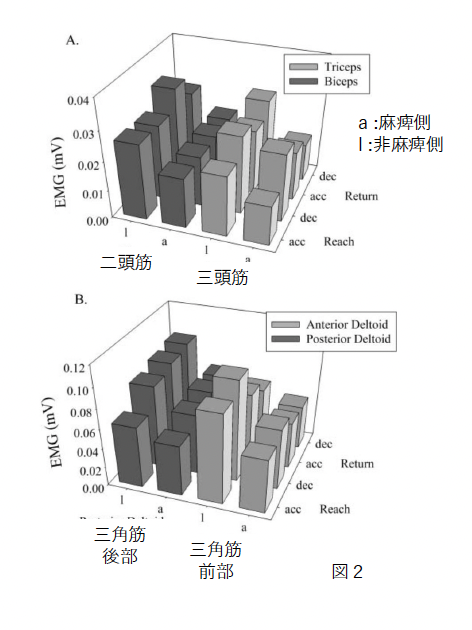 ・麻痺側の三角筋前部・後部と三頭筋の活動低下がみられた(図2より)