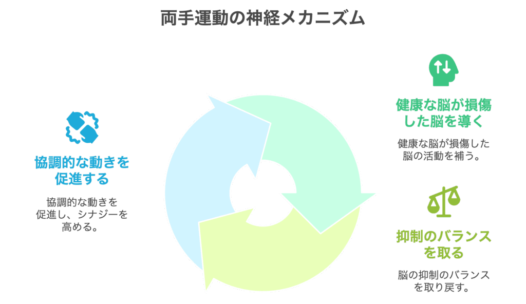 では、なぜ両手を同時に動かすことが、特に肩や肘の機能改善に良い影響を与えるのでしょうか。それには、脳の中で起こる3つの重要なメカニズムが関係しています。