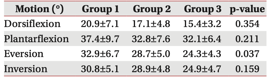 図はグループ毎のROM 上から背屈・底屈・外反・内反