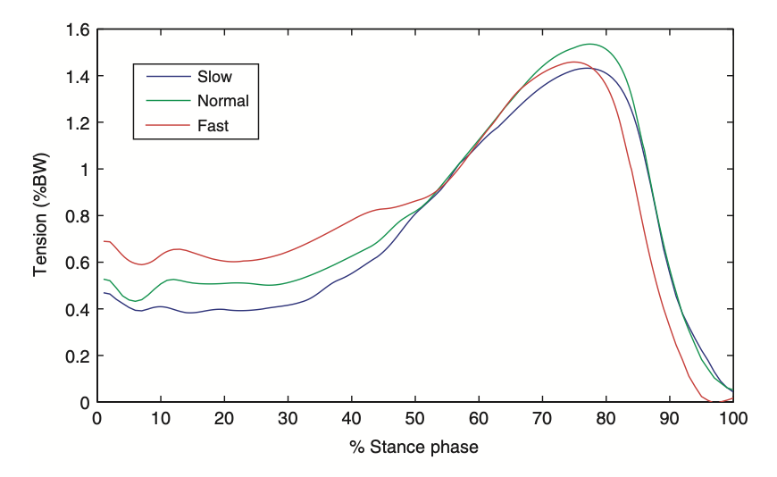 図は足底腱膜(PA)の張力を歩行速度別に比較