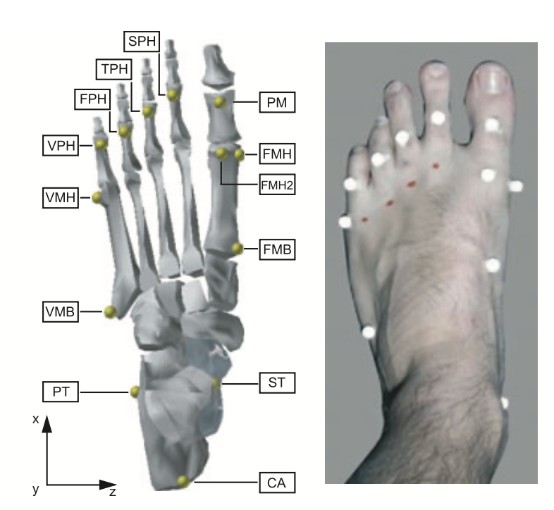 図は12個のマーカー位置と内側縦アーチの変形を測定するために使用される3つのマーカー位置
