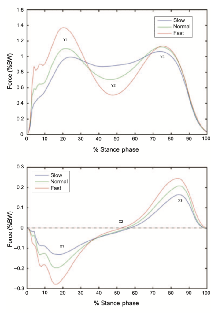 横軸は立脚時間を100%で正規化 縦軸は体重で正規化された力の大きさ