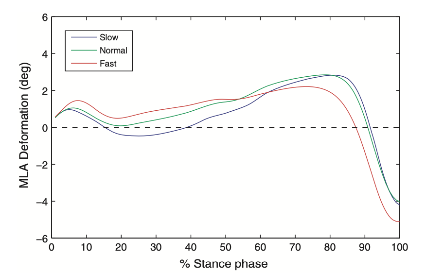 図は内側縦アーチ(MLA)の変形を歩行速度で比較したグラフ
