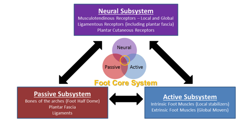 コア安定性の概念は足のアーチにも適用可能で、アーチは局所安定化筋と全体的な動作筋によってコントロールされている。局所安定化筋は足の4層の底部内在筋、全体的な動作筋は下腿から起始し、足に停止する筋肉である。