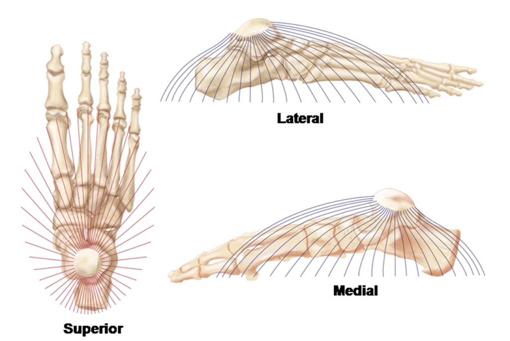 これらのアーチは機能的な半ドーム構造を形成し、足底腱膜と足底靭帯が主要な支持構造となっている