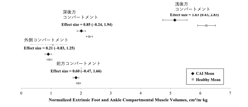 この研究では、CAIを有する若年成人と健常者の内在筋・外在筋の筋肉量と4方向の足関節筋力を比較しています。