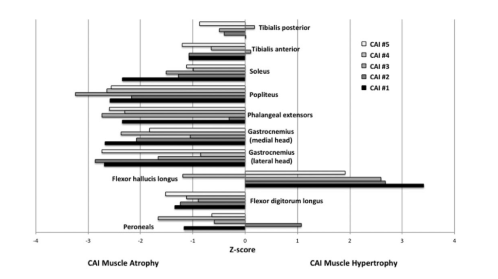 CAI患者は外側への圧力偏位を示す特徴的な歩行パターンを示すため、第1列の硬さと外側への足底圧の増加には関連性があるため、代償メカニズムとして回外位の足部と内側縦アーチを安定化させるために、長母趾屈筋への負担が増加し、持続的な負荷増加が時間とともに筋肥大をもたらす可能性が論文中では提示されています。