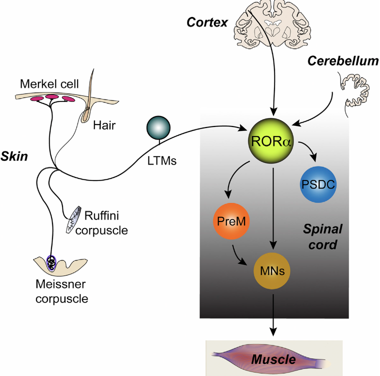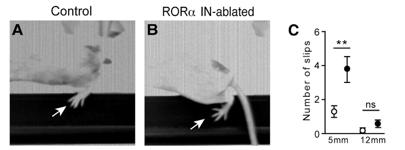 RORα介在ニューロンを除去したマウスは、軽い触覚への応答が低下・細いビーム歩行時のスリップが増加・一般的な運動機能は正常を示す