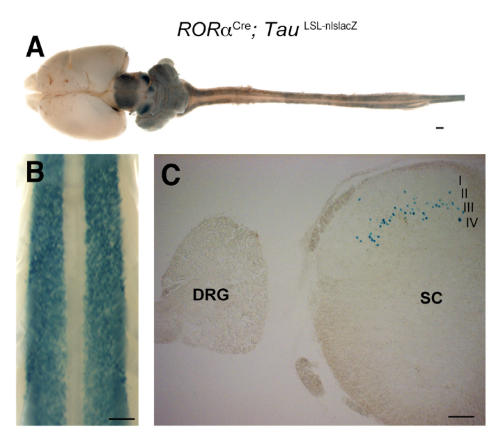 図のA-Cは、RORαCre;TauLSL‐nlslacZマウスのβ‐ガラクトシダーゼ発現