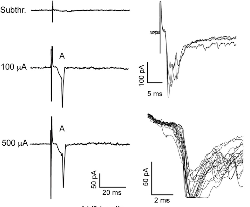 2Hz刺激で単シナプス性結合が確認された。短潜時‐低閾値入力を示している。