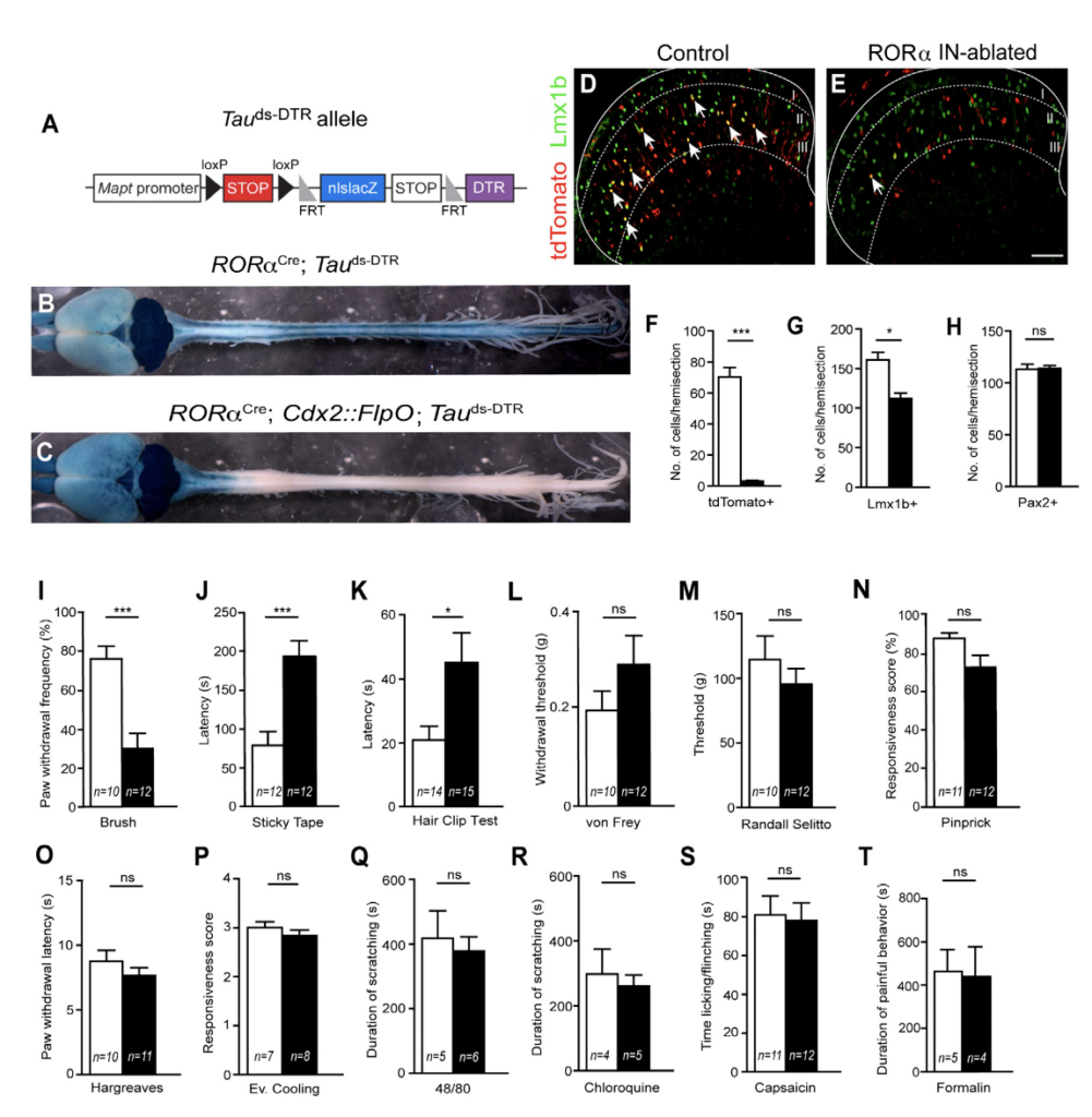 図はRORα介在ニューロンを除去した際の感覚行動への影響を示している(I〜T)