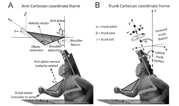 ・腕平面の動きは発症からの時間経過とともに増加し、体幹回転と組み合わさることで、中央および対側へのリーチ動作において異なる被験者群を区別できる