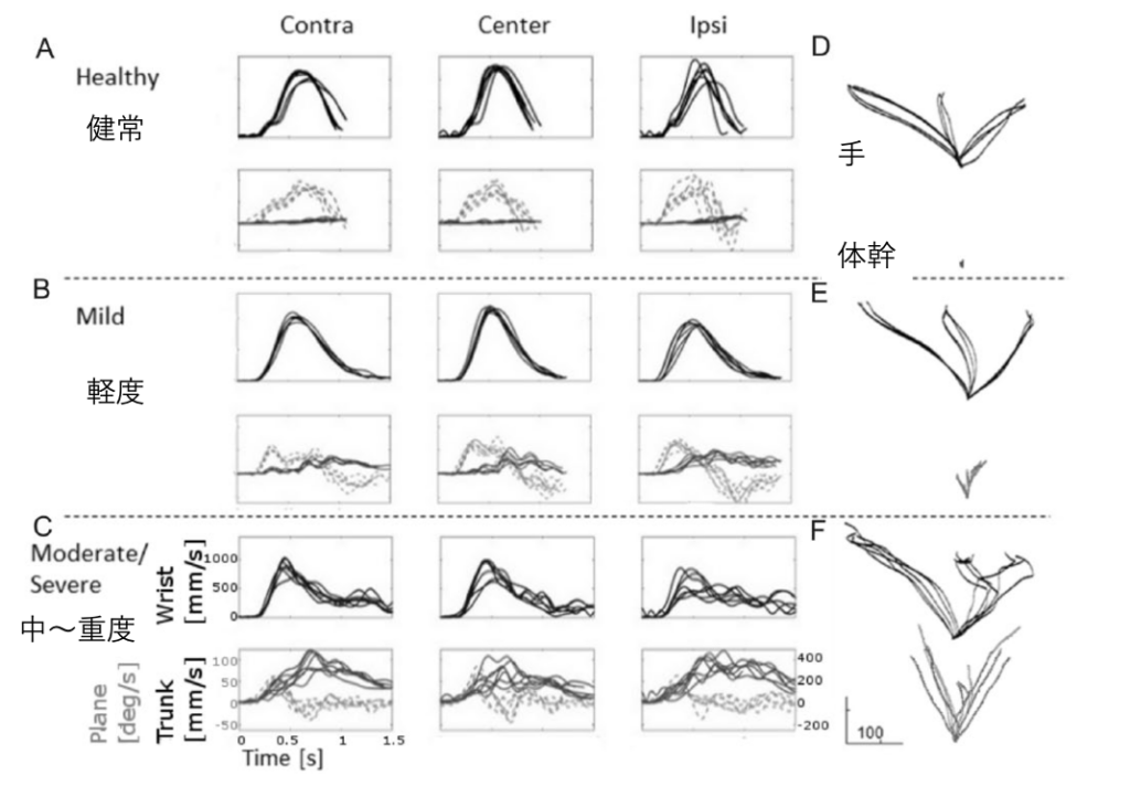中等度〜重度群は、明らかに遅い動作速度で滑らかさが低下(C)、リーチは曲線的となり、顕著な体幹移動と方向による軌跡のばらつきがある(F)