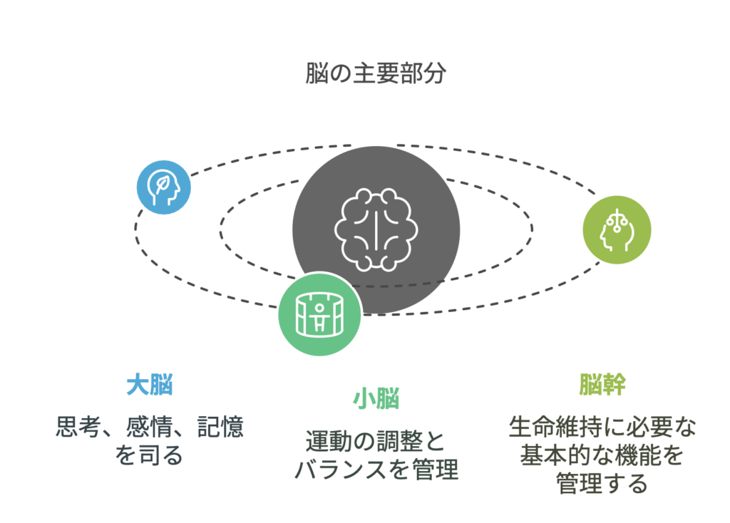 脳は主に三つの部分に分けられます:大脳、小脳、脳幹です