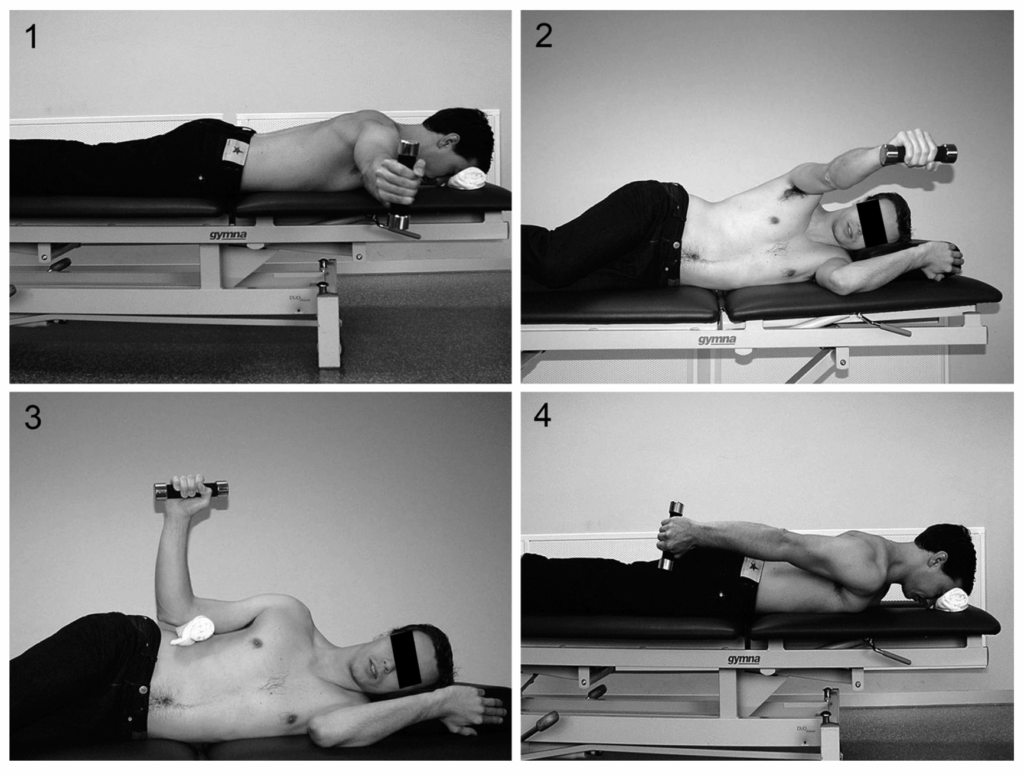 腹臥位で肩関節90度前方挙上位から開始し、腕を水平な位置まで水平外転させ、運動の最終域で外旋を加えます。