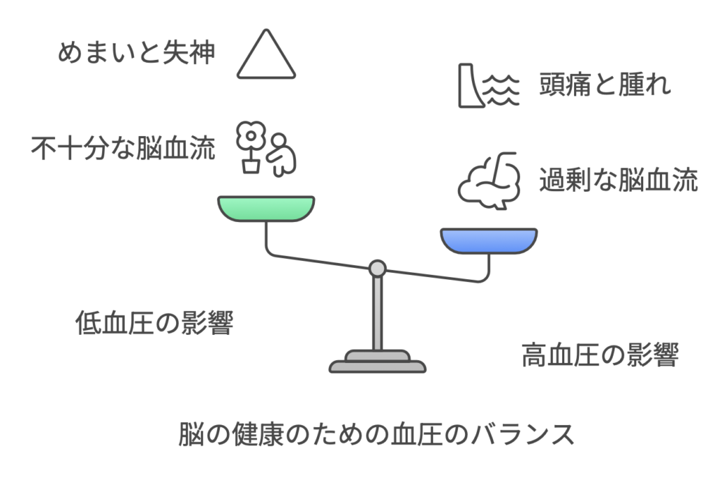 血圧が高すぎると(範囲の上限超過):脳に血液が押し込まれ、頭痛や脳の腫れなどの問題を引き起こす可能性があります