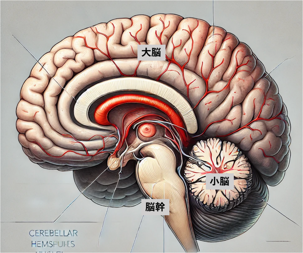 小脳(しょうのう)は、脳の後ろ側、ちょうど後頭部の奥に位置する重要な器官です。大脳よりも小さいですが、多くの神経細胞を含み、体の動きをスムーズにする役割を担っています。