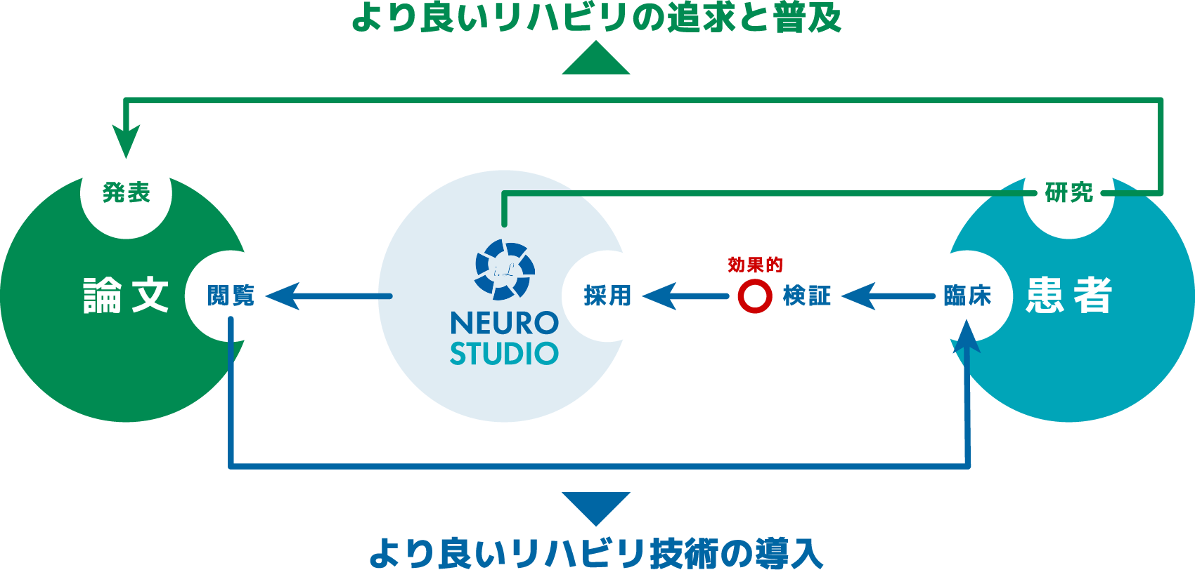 リハビリは日進月歩で新しい研究が進み、エビデンスがアップデートされています。ニューロではそれらの研究論文からエビデンスを収集しています。研究論文はただ参照するだけでなく、自社でも臨床による検証を行い、安心して受けていただけるものにしています。