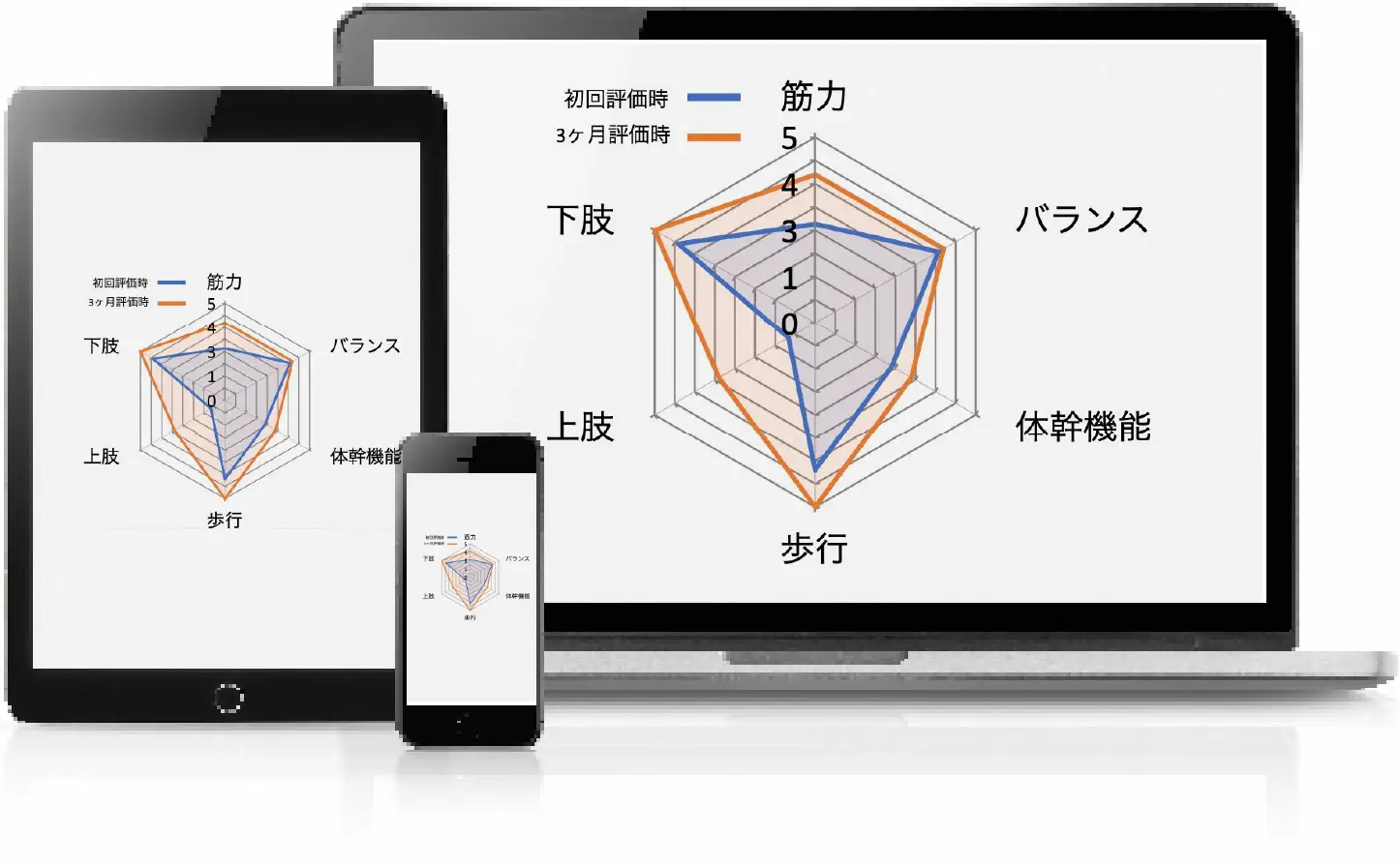 リハビリは私たちの提供するものだけでなく、利用者様の積極性が重要です。一生懸命に手足を動かす、どうしたら良いか自分なりに考えてみる、身体に起こったことに集中する、こういった前向きな姿勢があるとリハビリの効果は一層高まります。そのためには、利用者様自身が、身体に起きた「変化を実感する」ことが重要であり、変化を実感してもらえるように身体の変化を「見える化」しています。