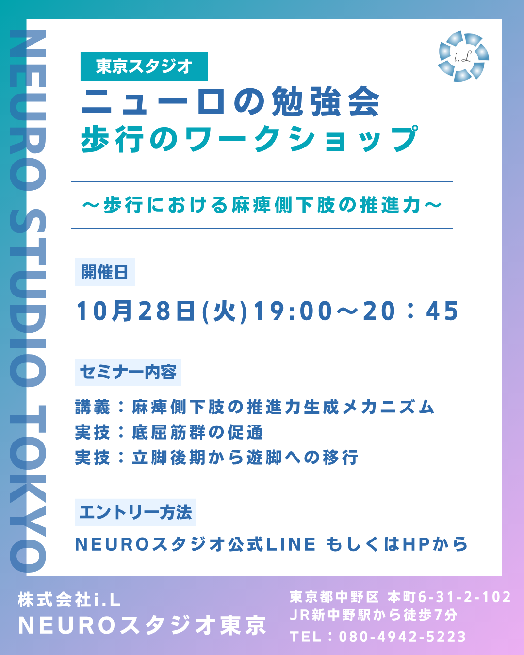 | 担当 | 森髙 良樹 株式会社i.L 代表取締役 NEUROスタジオ教育顧問 i.Solution研究会顧問 おくだ脳神経外科クリニック 森之宮病院 脳卒中認定理学療法士 |
